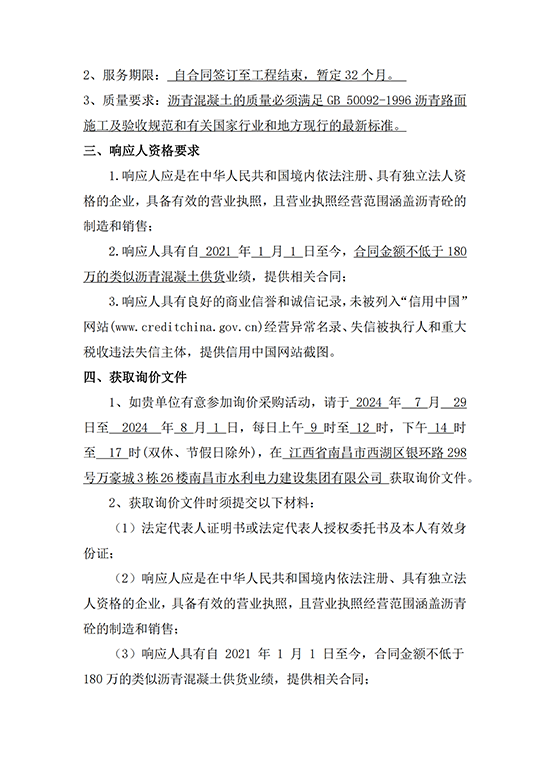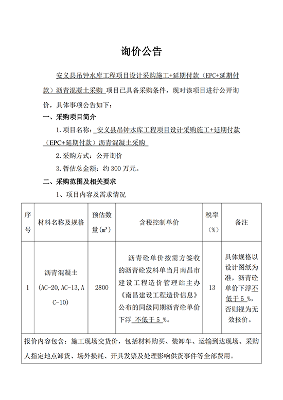 安義縣吊鐘水庫(kù)工程項(xiàng)目設(shè)計(jì)采購(gòu)施工+延期付款(EPC+延期付款)瀝青混凝土采購(gòu)詢價(jià)公告