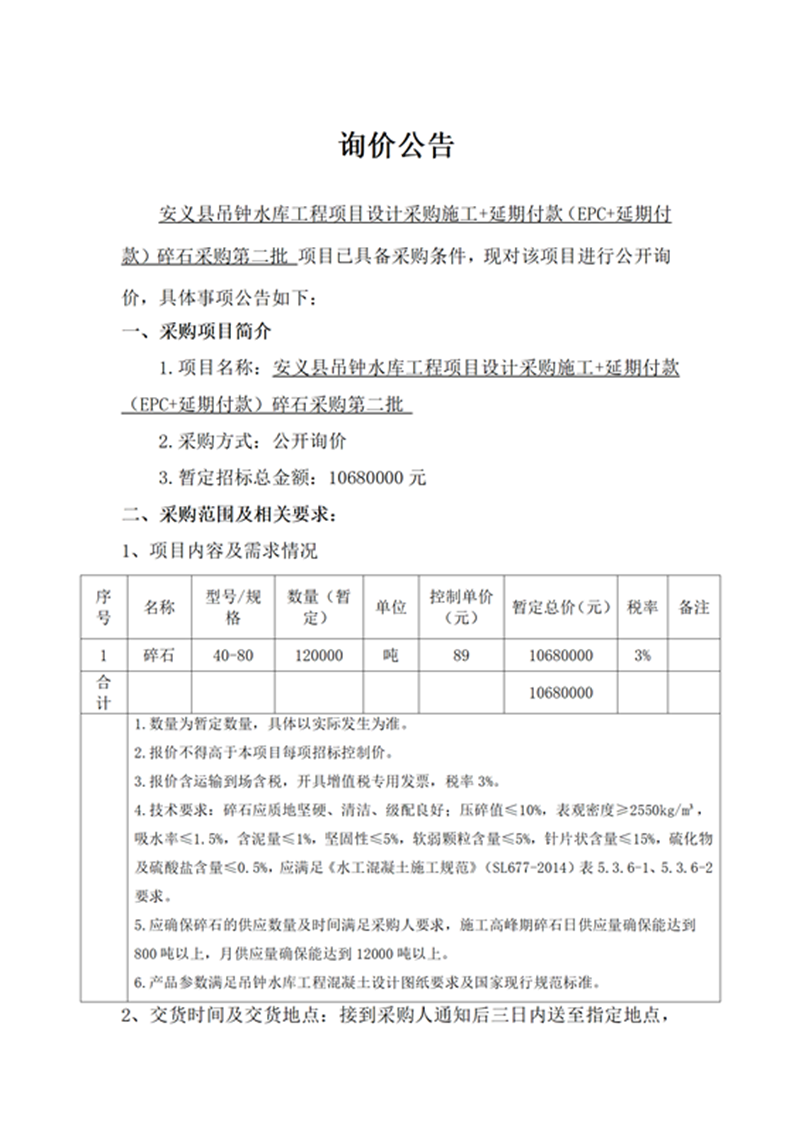 安義縣吊鐘水庫工程項目設(shè)計采購施工+延期付款(EPC+延期付款)碎石采購第二批項目詢價公告