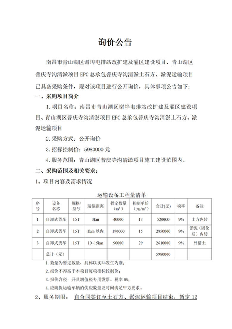 南昌市青山湖區(qū)謝埠電排站改擴(kuò)建及灌區(qū)建設(shè)項(xiàng)目、青山湖區(qū)普慶寺溝清淤項(xiàng)目EPC總承包普慶寺溝清淤土石方、淤泥運(yùn)輸項(xiàng)目詢價(jià)公告