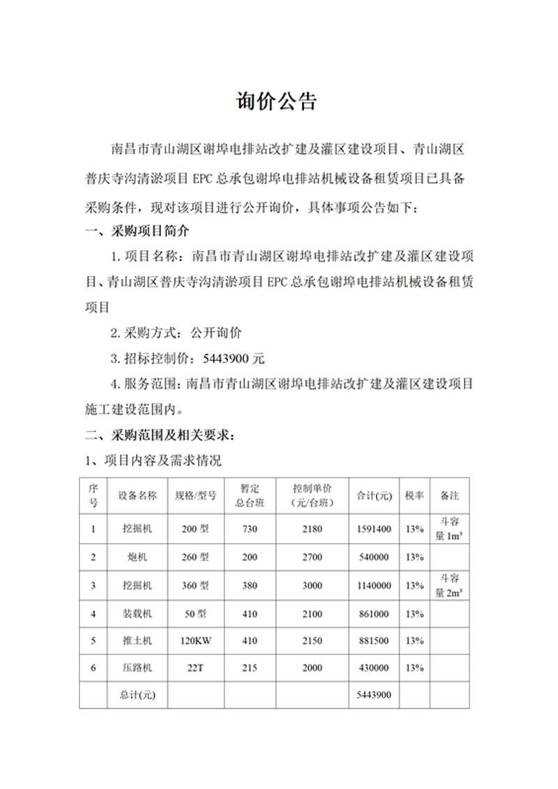 南昌市青山湖區(qū)謝埠電排站改擴建及灌區(qū)建設(shè)項目、青山湖區(qū)普慶寺溝清淤項目EPC總承包謝埠電排站機械設(shè)備租賃項目詢價公告