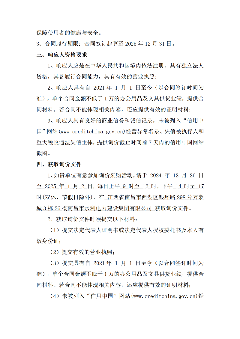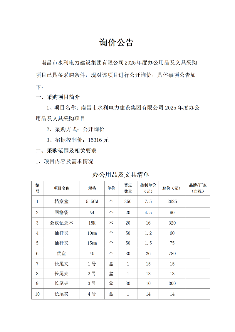 南昌市水利電力建設(shè)集團(tuán)有限公司2025年度辦公用品及文具采購項(xiàng)目詢價(jià)公告