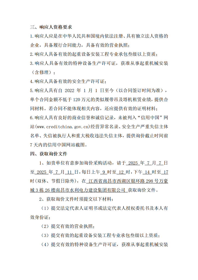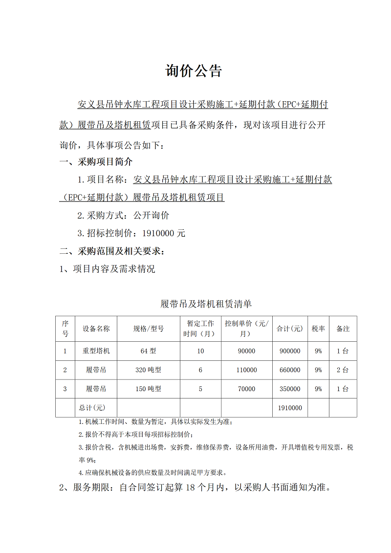 安義縣吊鐘水庫工程項(xiàng)目設(shè)計(jì)采購施工+延期付款(EPC+延期付款)履帶吊及塔機(jī)租賃項(xiàng)目詢價(jià)公告